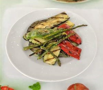 Pimiento rojo, pimiento verde, berenjena, calabacín y espárragos trigueros.
