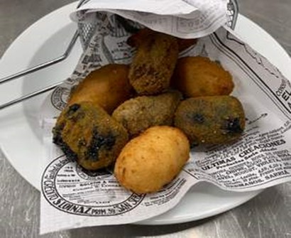 Croquetas de jamón ibérico, boletus , chipiron en su tinta y merluza con gambas.