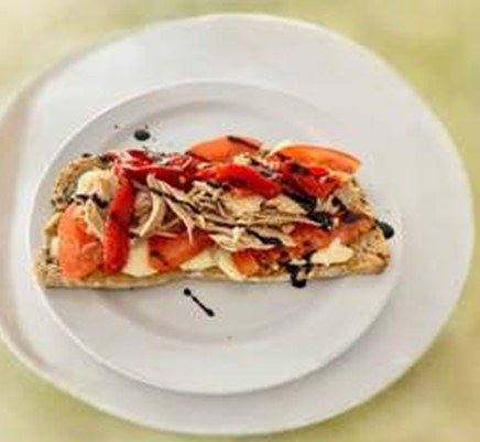 Base de pan con semillas, queso de arzúa, ventresca de atún, pimiento piquillo en tiras y reducción de Módena.